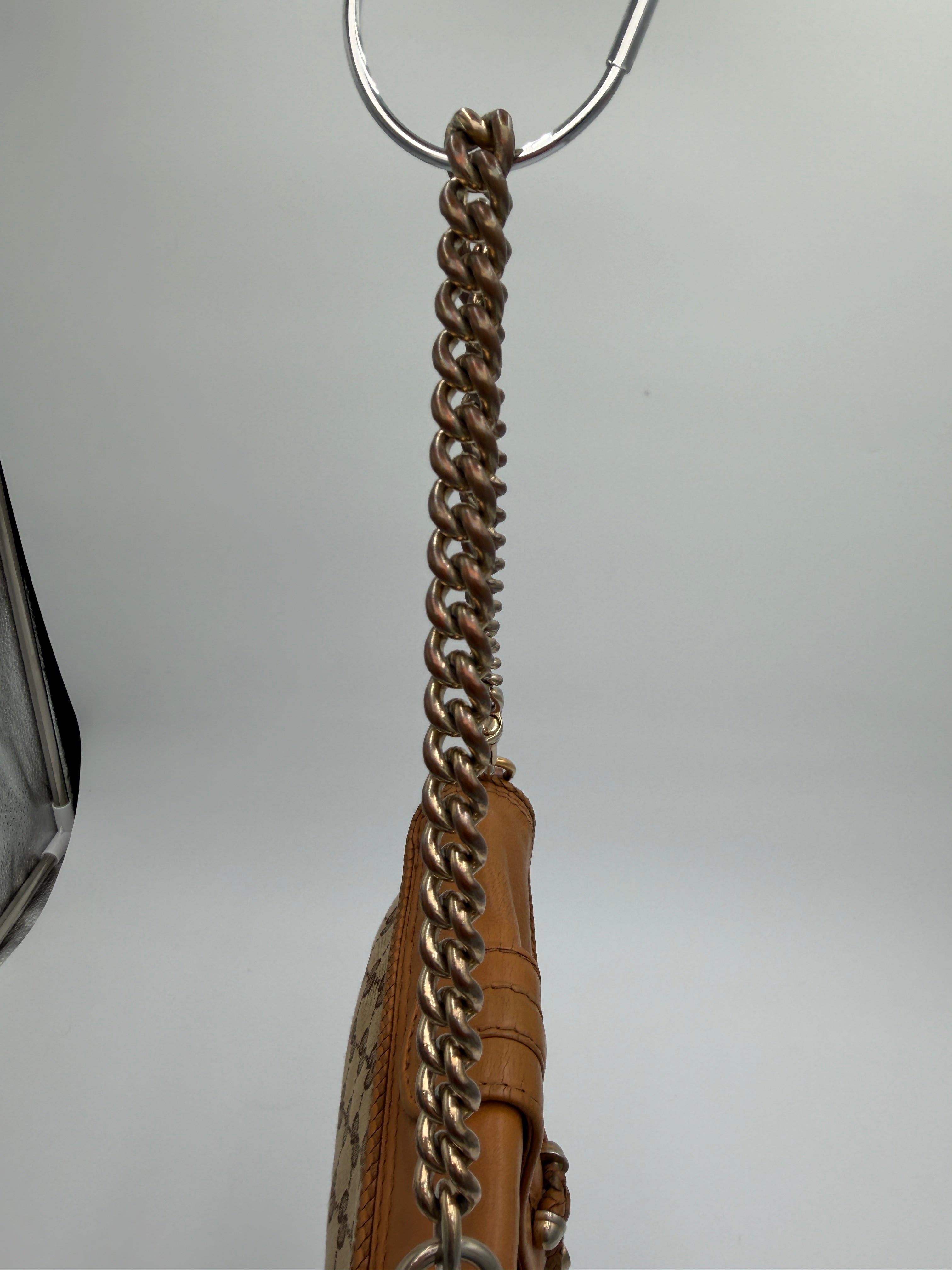 Gucci Color-Block Leather with Canvas Double G Monogram with fringe charm with chain strap and tassel.