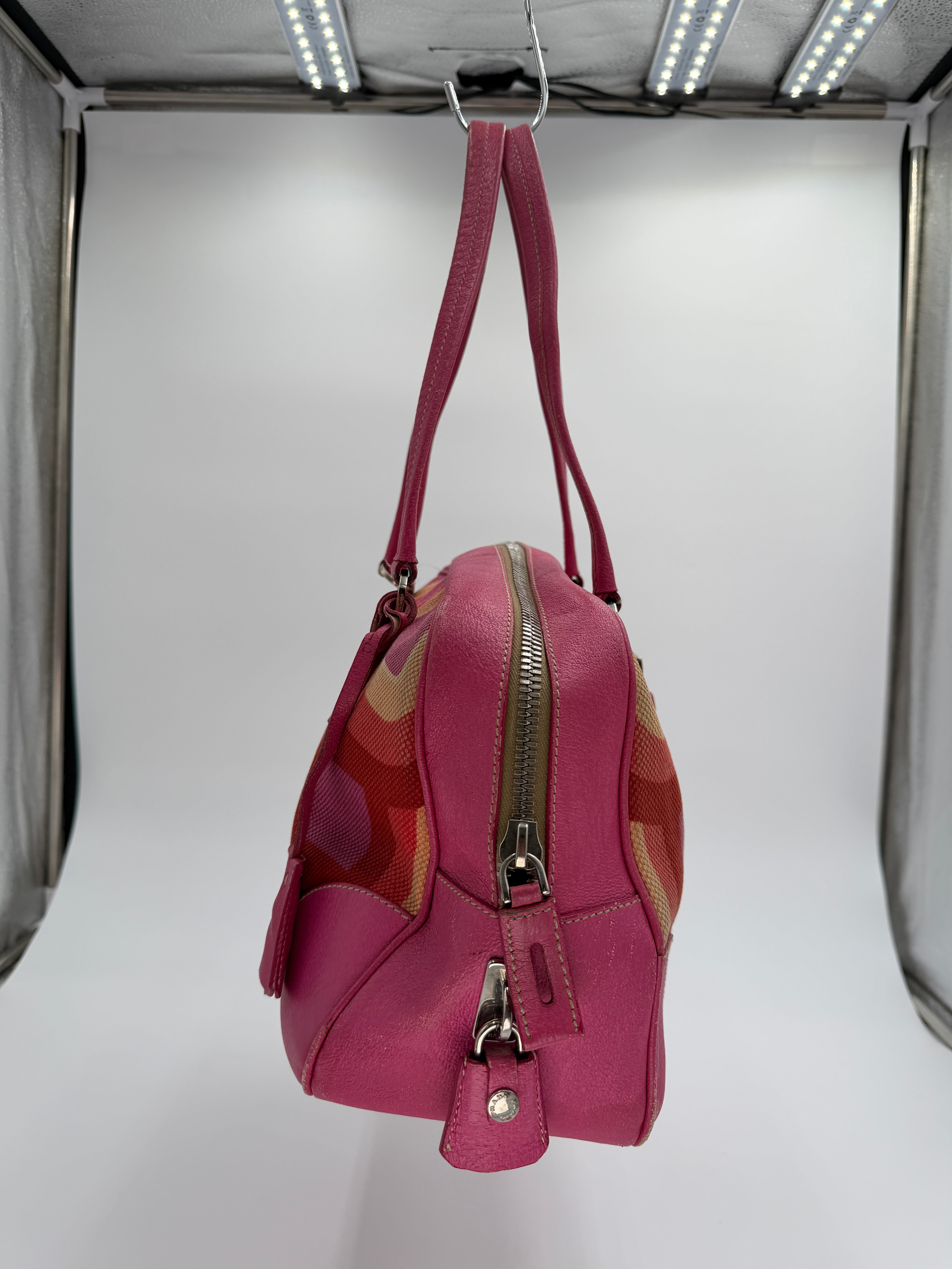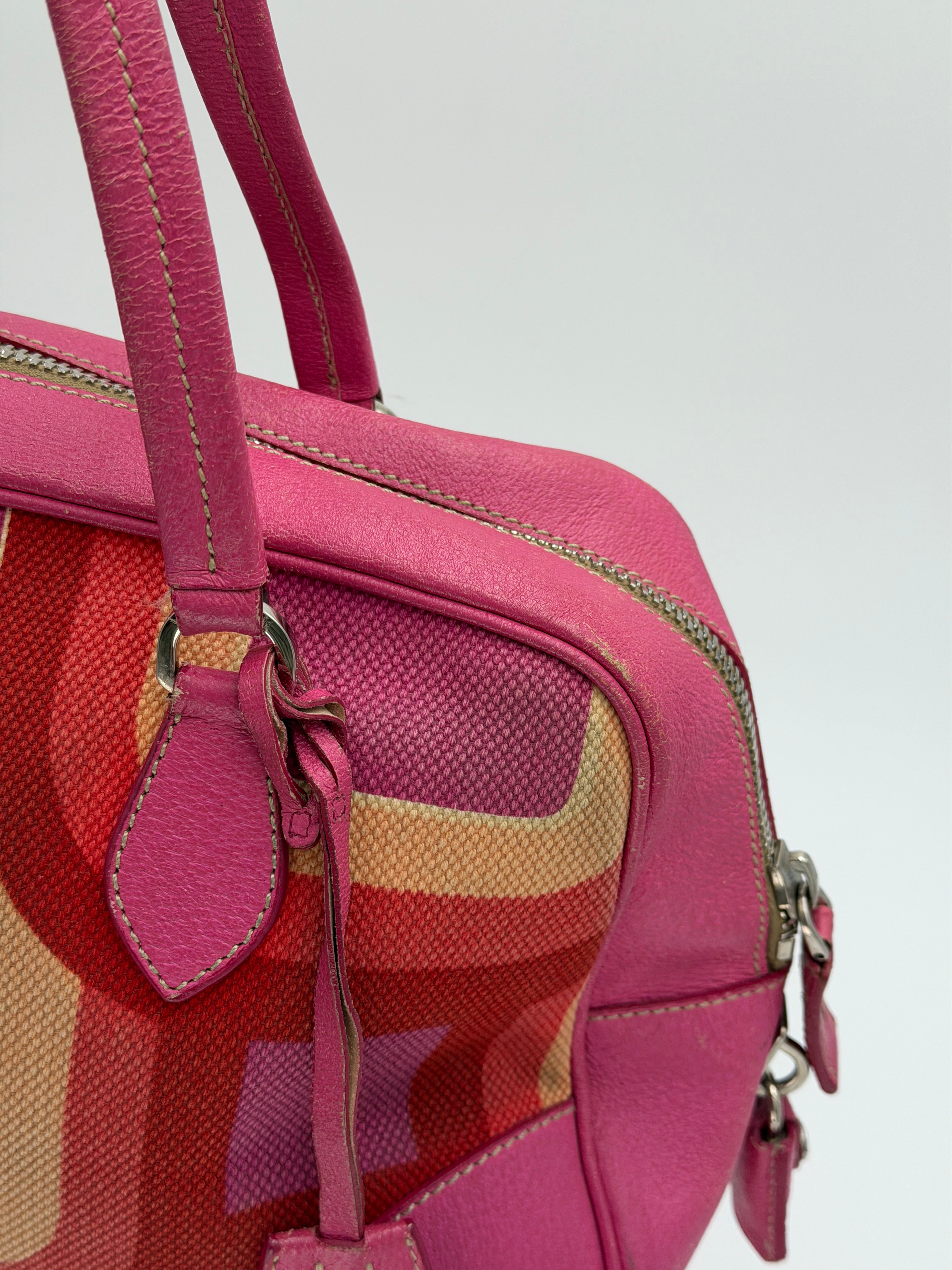 Pink, orange and tan geometric print canvas and leather handbag includes Lock, Keys, Clochette & Luggage Tag